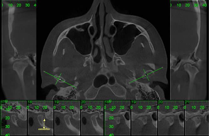 Paciente com assimetria, limitação de abertura bucal. Observa-se união óssea da porção posterior e lateral do côndilo ao esfeóide e zigomático.