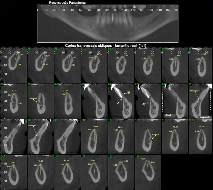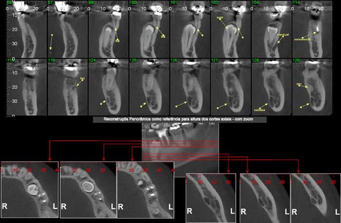 Na reconstrução panorâmica aparece uma régua no limite inferior que serve de localização para os cortes transversais.