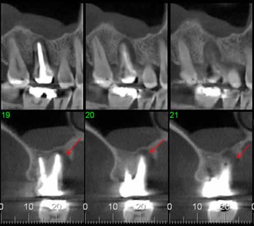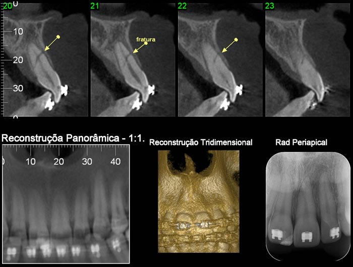 Achado radiográfico, na radiografia periapical de rotina, nota-se área de menor densidade na distal cervical e alteração no contorno na mesial, e rarefação óssea periapical. Ao exame tomográfico pode-se observar o dente 11 com osteólise apical e área de reabsorção na distal e reabsorção por substituição na mesial.