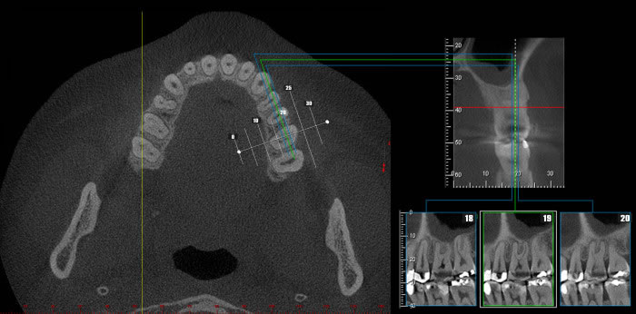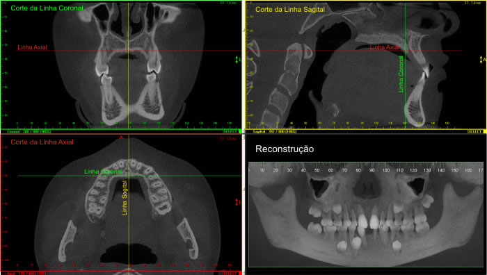 Nos softwares há ferramentas que permitem a reconstrução e a obtenção de novos cortes que mostram imagens de uso pontual na odontologia como os cortes transversais e longitudinais.