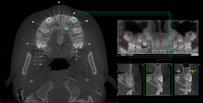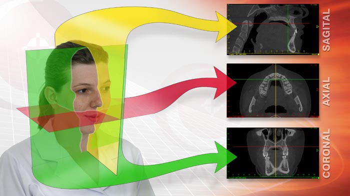 Essas projeções contêm toda a informação necessária para compor a matriz da imagem em 3D. Após a coleta da imagem, o paciente pode ser liberado, visto que toda a informação necessária para gerar as imagens de interesse está contidas na imagem matriz, que por sua vez fica armazenada nos nossos computadores. Cortes nos três planos (axiais, coronais e sagitais) do paciente podem então ser obtidos a partir desta imagem tridimensional. É possível também obter reconstruções panorâmicas e cefalométricas a partir do arquivo. As imagens podem ser fornecidas em filmes, papel colorido e em CD (arquivos DICOM, PDF ou Dentalslice).