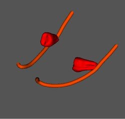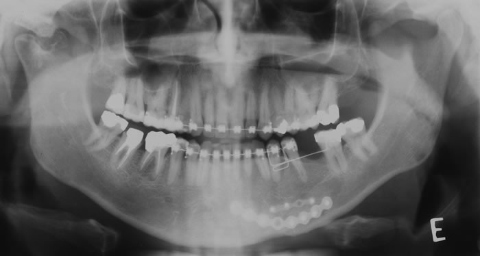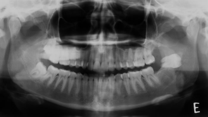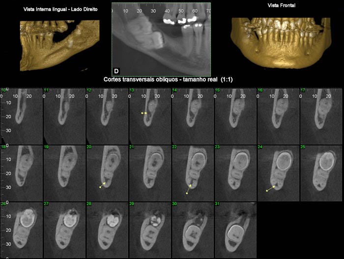Dente 47 e 48 retidos, em posição mésio horizontal, sobrepostos com raízes superpostas ao canal mandibular. Ao exame tomográfico identifica-se o canal passando rechaçado entre os ápices do 48 e a cortical vestibular e passando entre as duas raízes mesiais do dente 47.