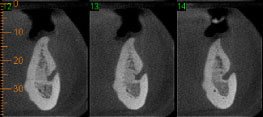 Exame tomográfico de rotina para estudo de implante em áreas edêntulas posteriores. Observa-se perda da cortical vestibular no dente 41.