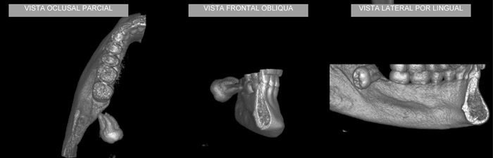 História clínica de exodontia do dente 38 há um ano, sem no entanto localizar o elemento dentário acreditando que o paciente havia engolido o dente. Na radiografia panorâmica observa-se a presença do dente 38 superposto ao ramo. Na tomografia localiza-se o dente no assoalho bucal.